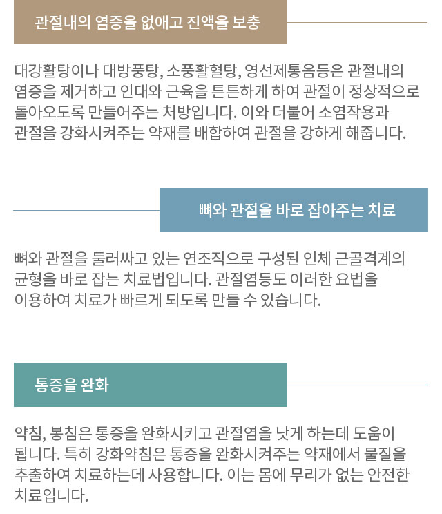 염증을 없애고 움직임에 지장이 없도록만들어주는 치료법을 만나보세요.