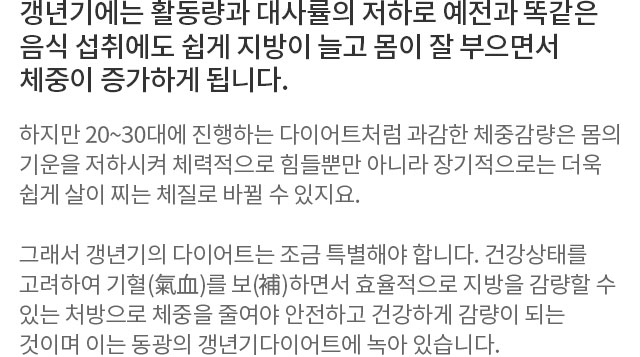 건강상태를 고려하여 기혈을 보하면서 효율적으로 다이어트를 하는 동광을 만나세요.